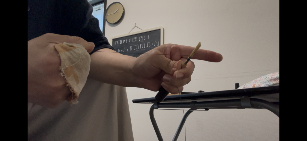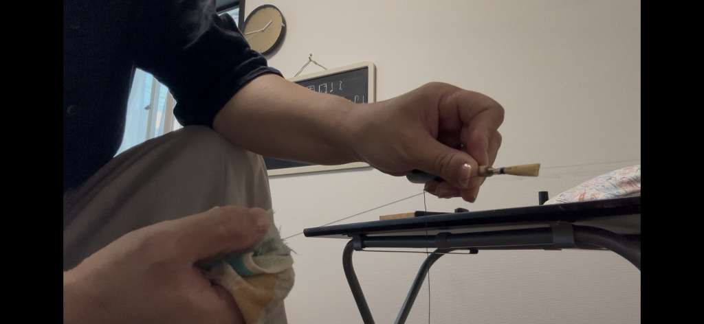 実はこの工程は夏の間にとっくに終わっていて、今回3周目だったりします(2周目は特殊管リードを多く作っていました)じゃあどうしてこんなにブログの更新が遅くなったのかというと・・・この糸巻きの工程の写真を撮り忘れてしまったから(涙)まあ今回の写真も見やすいものではないんですが、無いよりマシかと動画を撮ってそこから写真にしてみました。
